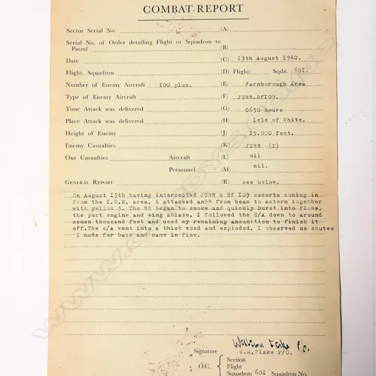 A WWII Squadron 601 Flight 'Combat Report' Estimate: $300