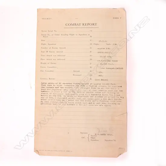 A WWII Battle of Britain 'Combat Report' logged by Flying Officer Carl Raymond Davis Estimate: $300