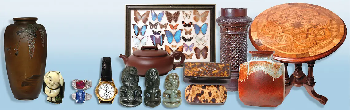 Another fantastic offering including Part 2 of the Tui Flower Estate, together with other estates & private vendors; a lifetime collection of N.Z. chimney pots, pipes, etc., vintage coats, walking sticks, toys, medals, militaria, Pacific, African and Maori artefacts including a superb collection of pounamu hei tiki, extensive Len Castle collection, English & European china, Japanese and Chinese bronzes, ivories and ceramics. The second session starts at 5.00p.m. with magnificent jewellery; emerald, sapphire, ruby and diamond rings, earrings, bracelets, opals & other precious stone jewellery. The objet de vertu section has further highly collectable items from the Flower Family; snuff boxes, mulls, enamel boxes, card cases, wax seals, etc. Clocks & watches include a Patek Philippe wristwatch, collector’s silver, cutlery, trays, tea-sets, etc. Persian rugs and carpets, Seuffert inlaid card table, Herman Miller chairs, scotch chests, dining tables & so much more. Fine Art includes; John Weeks, Terry Stringer, Lance O’Gorman, Barry Lett gallery prints, Salvador Dali lithographs plus further fine entries. Another 'Must View' auction.