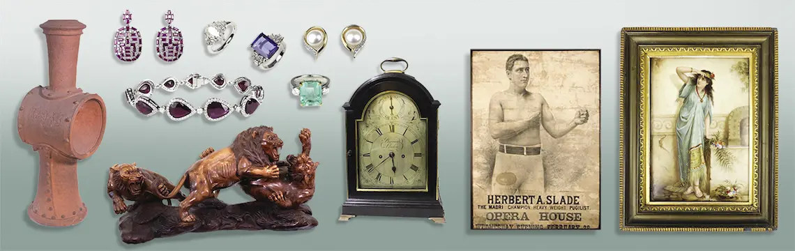 Welcome to our first Jewellery, Antique and Art Auction to be held at our wonderful new premises 553 Mt. Eden Road, Mt. Eden. We and the rest of New Zealand are gradually getting back to normal and we look forward to seeing you at our auction. We can also offer live online bidding, absentee bidding & phone bidding. In this auction we have on offer items from various estates & private collectors including items from the natural world, toys, books, militaria, NZ fossils, Maori artefacts & folk art, a rare poster of the 1880s Maori boxer Herbert Slade, an impressive Barry Brickell sculpture, plus other NZ pottery. The Modern Movement includes a Liberty’s of London section, Clarice Cliff etc. Waterford glass, KPM hand painted plaque & other European china, good Chinese & Japanese collectables, carvings, ceramics, figures and artwork. The second section opens with an exceptional display of jewellery including large diamond rings & impressive necklaces & bracelets, emerald, ruby, sapphire, kunzite, tanzanite, aquamarine rings & earrings, amber, gold chains, Edith Morris & Ida Hudig pieces, wrist & pocket watches, mantel & wall clocks. Silver includes cutlery, Irish silver, 19thC tray, tea set, bowls, etc. Persian rugs, furniture & decorator items, Black Forest type bear bench, extraordinary large carved lion group, NZ furniture, two vintage shop display cabinets, good dining tables, modern vintage style enameled drawers, designer furniture, a large impressive mirror, garden pots & statuary, greyhounds etc. The art section includes a bronze by Theo Janssen, work by Raymond Ching, Stenberg, Minnie White, Lance O’Gorman, Aston Greathead, Peter Beadle with works from other NZ and international artists. This is a must view auction & a chance to see our fabulous new premises. Further quality entries being accepted now for future auctions. Please email images for a no obligation appraisal to enquiries@cordys.co.nz A buyer's premium of 15% + GST = 17.25% all-up applies to all Cordy's auctions