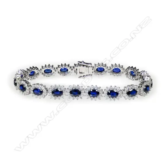 A 14ct white gold, Ceylonese sapphire and diamond halo bracelet,