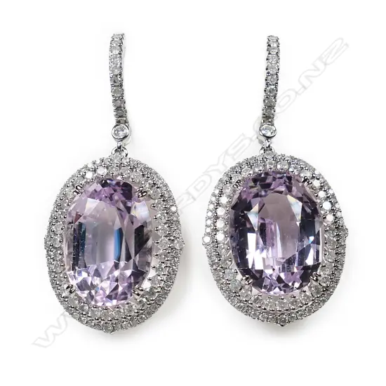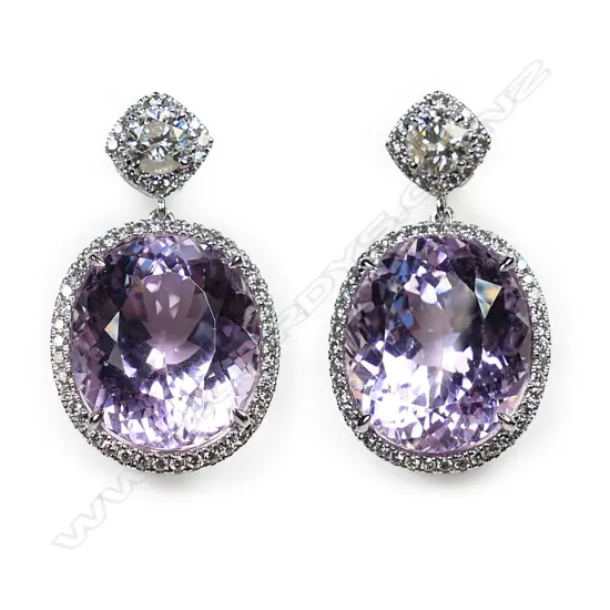 A pair of 14ct white gold, kunzite and diamond drop earrings,