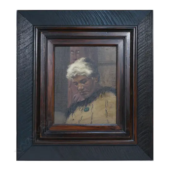 A c.1900 Sherwin & Cotton Māori portrait tile of the chief 'Matene Te Nga', depicted with full moko and in a korowai (cloak), the chief of Ngati Maru iwi, entitled top left, the artist George Cartlidge’s monogram bottom right, maker's marks to reverse. 225 x 150mm.Professional restoration, in old rewarewa frame, the reverse with outline and starting of Māori carved detail.