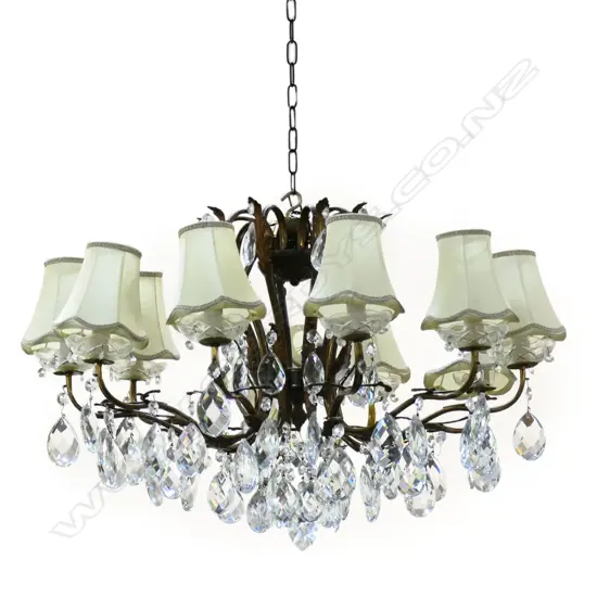 A mid 20thC French style ormolu chandelier, the 10 scrolling arms with acanthus leaf highlights, cut glass drip trays and multiple facetted pendant drops. Each light with a cream silk shade. Dia.800mm. Estimate: $850 - $1,600