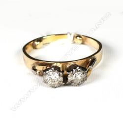 18ct? GOLD AND TWO STONE DIAMOND RING