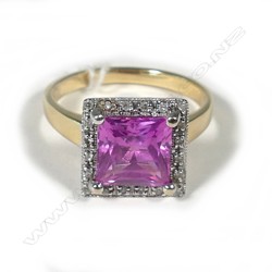 9CT GOLD PINK STONE & DIAMOND RING