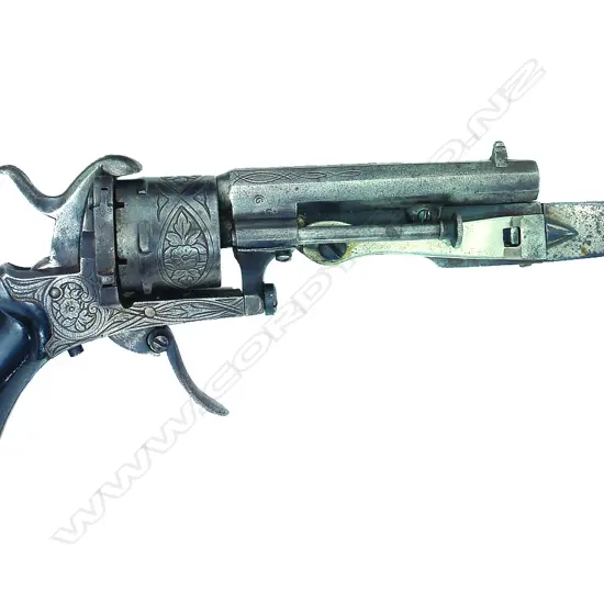 An antique European pinfire 6 shot 7mm cal revolver with side folding bayonet. 85mm octagonal barrel with proof mark. Open top cylinder and double action mechanism with folding trigger. Barrel