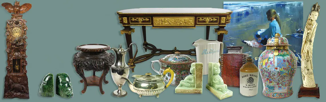 Starting at 9.30am we are privileged to offer The Slater Collection Part I of New Zealand historical pottery including many fine examples of rare Crown Lynn, Wharetana ware, etc., many coloured McAlpine fridge jugs, trickle glazed animals, Titian ware, etc. also included from various estates and private vendors we have fishing items, a wide array of miscellaneous, taxidermy, military, New Zealand historical, art glass, Skeaping Wedgwood animals, fine porcelain and China, Worcester, Moorcroft, etc. The Oriental section of over 100 lots includes Chinese jade, porcelain, ivory, etc. At 5pm we have the jewellery section of 120 lots which includes a spectacular diamond necklace, diamond bangles, bracelets, earrings, a good selection of precious stone rings, etc., Rolex watches, cased ships chronometer, French clocks, long case clocks, collectors silver, a good selection of Georgian, Victorian, colonial and Oriental furniture and decorator items. The art section is one of our strongest for many months including good examples of modern, contemporary and historical works by Peter McIntyre, Rudi Gopas, Steve Harris, Robin Morrison, Tapper, Payton, Raymond Ching etc. This auction is a must view.